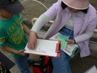 先生を見つけると,シールを貼ってもらいました。クジャクの檻では,クジャクが大きく羽を広げているのを見て,感嘆の声を上げていました。他のグループと出会うと,情報交換もしました。