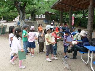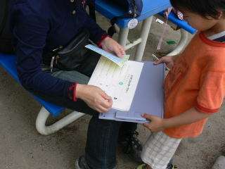 約1時間のウォークラリーのゴール,荷物を置いている場所に先生が待っていて,ウォークラリーの用紙にゴールのシールを貼ってくれました。ゴールした後は,ウォークラリーの用紙の整理をしました。