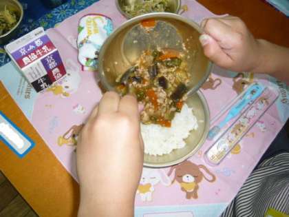 今日の給食は,「夏野菜のあんかけごはん」でした。夏野菜は,シリーズ「季節の食べ物・京都の食べ物」の中の「万願寺とうがらし」と「なす」が入っていました。他にも「にんじん」や「たまねぎ」,「鶏肉のひき肉」なども具として入っていて,ごはんにかけておいしくいただきました。