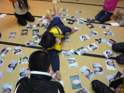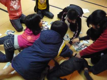 初日の今日11日(火)は,中間休みにAグループの子どもたちが,楽しそうにルンルンカルタ大会を行っていました。Aグループは2年生男女1人ずつと,3年生の女子1人,4年生の男子1人,5年生の女子人1人,6年生の男子1人の,6人のグループです。Aグループのめあては,「みんな仲よく,難しいことにも挑戦するグループになろう。」です。Aグループの6人の子どもたちは読み札が読まれるたびに,目を皿のようにして絵札を見つめていました。