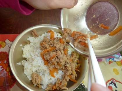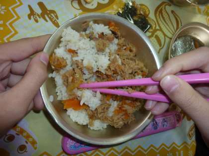 「すいとん」以外のメニューは,マグロフレークにたまねぎ,にんじん,しょうが,しいたけが入った「そぼろ」をご飯にのせて(画像左),お箸で混ぜて(画像中),最後にきざみ海苔をかけて(画像右)食べる,「そぼろ丼」でした。「すいとん」とともに,「そぼろ丼」もおいしくいただきました。