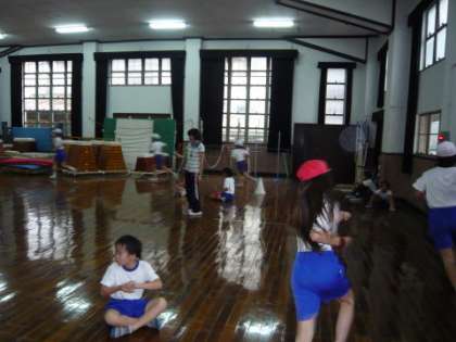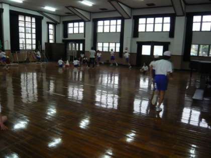 毎週火曜日と金曜日に実施している「部活動」,今日はあいにくの雨のため普段使っている運動場が使えず,講堂で実施しました。本校の部活動は「総合型」1種目で,今月は陸上運動にがんばって取り組んでいます。