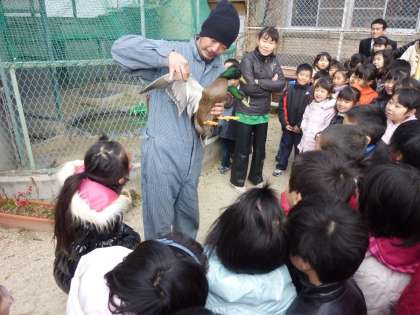 園長さんの両腕に抱きかかえられて,「テルテル」と「クロスケ」が小屋から出てきました。今日初めて子どもたちは,「テルテル」と「クロスケ」に触れることができました。子どもたちからは,「フワフワして気落ちいい。」や「すごくきれい。」などの声が聞こえてきました。その後,園長さんから,「合鴨」や「アヒル」などについてのいろいろな説明を聞きました。