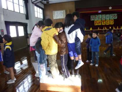 誕生月の子どもたちの自己紹介が終わると,お楽しみの「ゲームコーナー」でした。今日の誕生児童集会が最後とあって,いつもとは趣を変えた「なかよしラリー」を行いました。講堂にゲームコーナーが5つ設けられ,なかよしグループのメンバーがそろってゲームコーナーを回りました。画像中は「おちたらいかんよ平均台」のコーナーで,なかよしグループ全員が平均台をかけぬけました。画像右は「どきどき10秒」で,跳び箱の上になかよしグループ全員が乗って,10秒間辛抱するというものでした。高学年が低学年をおんぶしたり,抱っこしたりして,工夫してこのコーナーを行っていました。