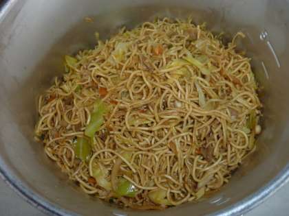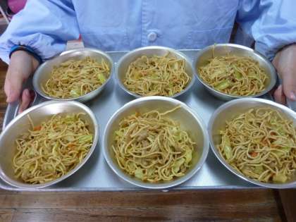 「ソース焼そば」は,台風が来たときに備えて学校に保管してあった,「中華乾麺」と「乾燥たまねぎ」が使われ,それに「豚肉」と「いか」,「にんじん」「キャベツ」が加えられていました。ウースターソースやバーベキューソース,塩,こしょうなどで味付けされていて,とってもおいしくいただくことができました。