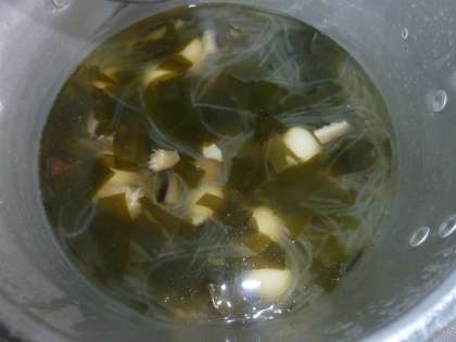 「わかめスープ」には,缶詰の「うずらたまご」や「わかめ」,「はるさめ」,「しいたけ」の具が入っていました。ソース焼そばに負けず劣らず,わかめスープもとってもおいしくいただくことができました。