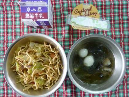 今日の給食の献立は,「ソース焼そば」,「牛乳」,「わかめスープ」,そしてデザートに「プリン」もついていました。今日の給食には,ご飯やパンがつかなかったので,いつもより麺の量が多く入っていて,ソース焼きそばをしっかりと食べることができました。