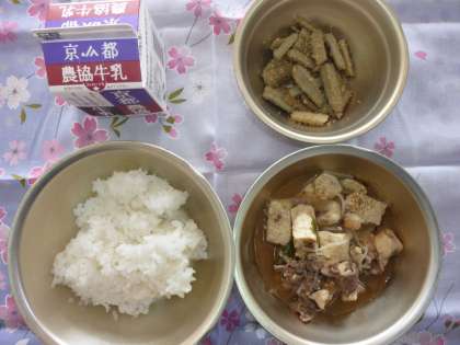 今日の給食の献立は,「ごはん」,「牛乳」,「すきやき風煮」,「たたきごぼう」でした。「すきやき風煮」は,牛肉や焼どうふ,たまねぎ,白ねぎ,糸こんにゃく,切りふがたっぷりと入っていて,砂糖や料理酒,こいくち醤油でしっかりと味付けされていて,とってもおいしくいただくことができました。また,たたきごぼうは,しっかりと歯ごたえがあり,これもおいしくいただくことができました。
