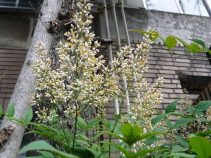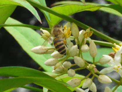 このナンテンの花の周りを,ミツバチが忙しそうに動き回っていました。