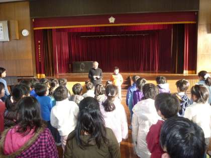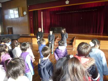 今日1月31日(月)始業前(1時間目が始まる前)に,「臨時朝会」を講堂で実施しました。今日の臨時朝会は,先週の月曜日(24日(月))に転入した3年生男子児童と,今日から2月4日(金)までの5日間本校でチャレンジ体験を行う,洛東中学校の生徒男女1名ずつを紹介するために実施しました。
