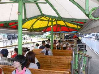 スチーム号はトロッコ列車風の2両の客車を,この日はD51(デゴイチ)が牽引していました。「ボォー」というものすごい汽笛が鳴って発車,往復約1キロメートルを,約15分かけて乗車しました。
