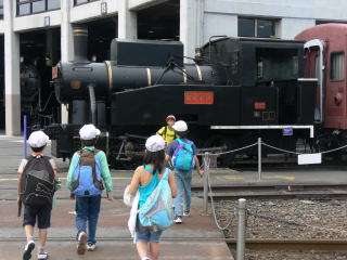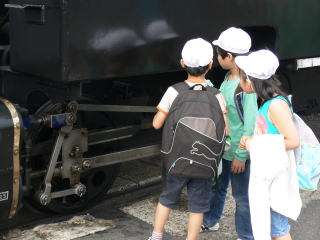 楽しかったスチーム号の乗車が終わると,3つのグループに分かれて蒸気機関車館内の見学をしました。真ん中の画像はとっても可愛いB20という蒸気機関車です。他の蒸気機関車に比べて,動輪がすごく小さいことに気がつきました。