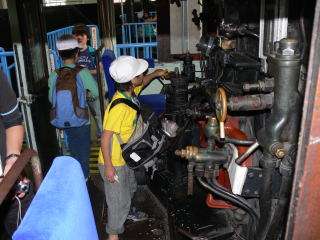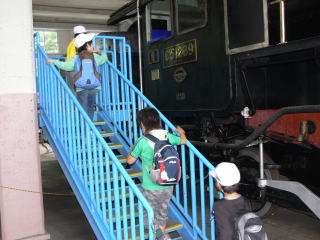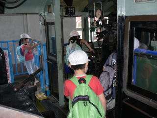 ずらりと並んだ蒸気機関車の,内部を見学することができました。いろいろなレバーに触ったり,運転席に座ったり…。