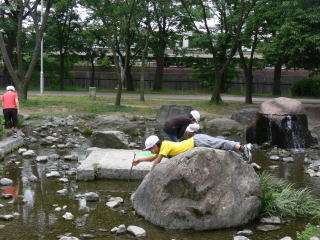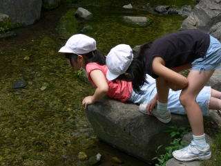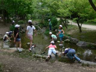 お弁当までの遊びタイムでは,水が流れる「河原遊び場」で,水中の虫や魚をを探しました。