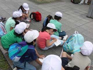 河原町松原のバス停から,市バス205番に乗って最初の目的地「京都駅」に向かいました。乗車すること約10分,京都駅に到着すると,周りを見渡して見たものや見えたものを確認して,しおりに書き込みをしました。