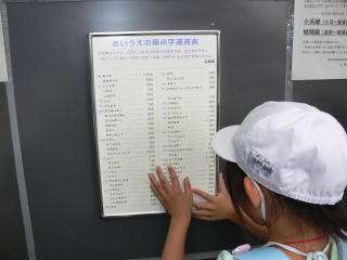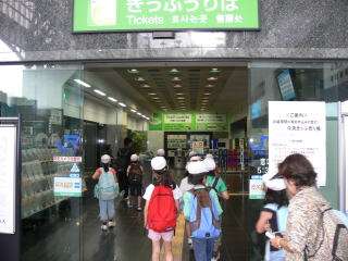 券売機のそばに,点字で書かれた案内の札を見つけました。券売機もよく見ると点字のシールが貼り付けてあり,バリアーフリーが進んでいることがよく分かりました。券売機では買えない,遠くへ行くための切符を販売する「みどりの窓口」も,少しだけ見させていただきました。次に2階に行くと,電車が発着する様子がよく見えました。