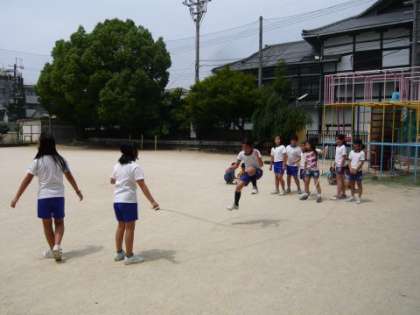 中間休みに4年生の子どもたちが全員そろって,運動場で「大なわとび」をしていました。4年生は火曜日と木曜日を「みんな遊び」の日と決めて,遊び係が「みんなが楽しくできる遊び」を考えて,みんなで遊ぶようにしています。今日は大縄の回し役を順番に決めて,楽しそうに大なわとびをして遊んでいました。みんなでなかよく遊ぶって,とってもいいことですね。