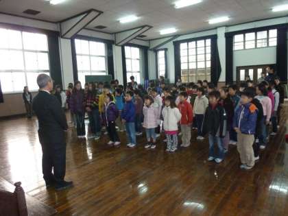 水野さんの紹介に続いて,「昨日の感動を,もう一度思い出してください。」から始まる,昨日開催された「大文字駅伝」大会での,6年生の活躍の様子が校長先生から子どもたちに紹介されました。