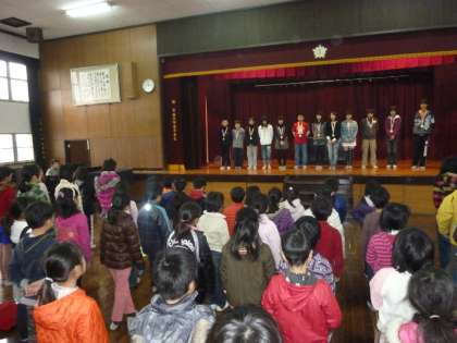 校長先生から「大文字駅伝」大会出場記念のメダルを首に掛けてもらった6年生の子どもたちは,「48位という結果だったけど,みんなが心を一つにしてタスキをつなぎきったことがよかった。」や「練習の成果が,出し切れてよかった。」,「地域のみなさんの応援や支えが,とってもうれしかった。」,「大文字駅伝大会に出場することができて,いろいろな勉強ができた。」などと,一人一人が大文字駅伝出場の感想を話しました。その後,5年生の代表から,「新道小学校のみんなの思いを胸に,最後まで走り抜いてくれてありがとうございました。6年生のみなさんは,新道小学校のみんなの誇りです。」という話と,全員で高らかに校歌を歌って,6年生の昨日の活躍を称えました。