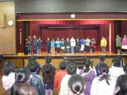 今日の朝会の最後は,保健委員会からのお知らせでした。保健委員会のお知らせは,風邪やインフルエンザの予防についての話やクイズで,手洗いやうがい,早寝早起きの大切さなどが盛り込まれていました。保健委員会の子どもたちは,「規則正しい生活をして,健康な冬を過ごしましょう。」とまとめていました。また,来週2月14日(月)に実施する「スケート教室」で,けがをしないための「6つのやくそく」を4年生の子どもたちが説明をして,今日の朝会を終えました。