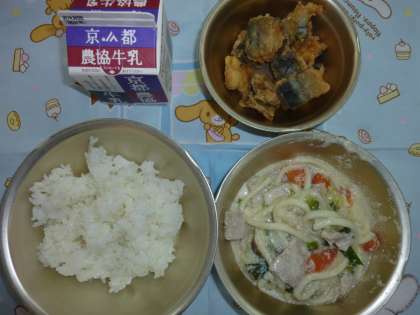 今日の給食の献立は,「減量ごはん」,「牛乳」,「豆乳鍋」,「さんまの梅酢あげ」でした。豆乳鍋に「うどん」が入っていたので,ごはんがいつもより減量されていました。とても温かい「豆乳鍋」に,さんまを梅干しや醤油,料理酒,酢,砂糖で下味をつけて,小麦粉と片栗粉をまぶして,油で揚げた「さんまの梅酢あげ」,両方のおかずともにとってもおいしくいただくことができました。
