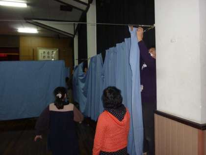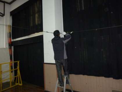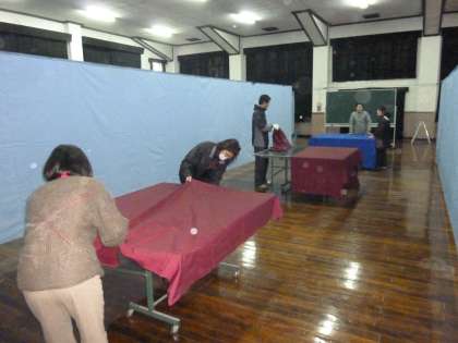 最初に,東西に長いワイヤーを3本,東側と西側に短いワイヤーを2本ずつ張りました。次に,張り終わったワイヤーに青いカーテンが取り付けられていくとともに,卓球台5台が用意され,青いカーテンの取り付けが終わると,卓球台に青色や紅色,黒色の布が敷かれて,今日の会場設営は終了しました。
