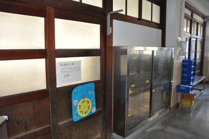 北館1階西端の給食室内南側(運動場側)に,「ランチルーム」がありました。ランチルームは,元々1年生の教室だったようですが,児童数の減少に伴い平成9年12月に,ランチルームとして整備され使用されるようになりました。ランチルームには,大きなテーブルが4台と椅子約50脚が用意され,学年ごとに曜日を決めて使用したり,縦割りのなかよししグループでの交流給食に使用したりしていました。このランチルームには手洗い場が設けられるとともに,カラフルなお盆などが入った食器棚も置かれていて,楽しい雰囲気で給食を食べることができました。また,ホワイトボードや掲示板には栄養指導の掲示物が張り出され,いかにも食事をするための部屋という雰囲気をもっていました。