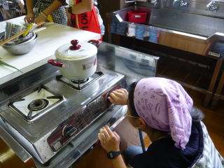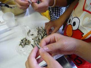 2時間目が始まると家庭科室に集まり,最初にあらかじめ吸水させておいた米の入った鍋に点火しました。続いてみそ汁の出汁になる煮干しの,頭とはらわたを取り除きました。