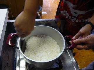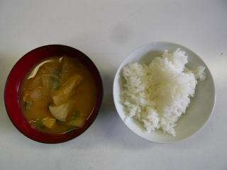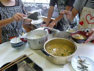 ご飯がふっくらと,おいしそうに炊きあがりました。みそ汁もできあがって,お茶碗とお椀に盛りつけの開始,どうです,おいしそうでしょう。