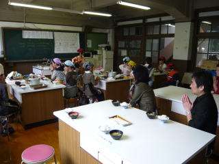 保護者のみなさんと一緒に「いただきます」,ご飯もみそ汁もとってもおいしくできていました。会食の後は,しっかりと後片付けをしました。