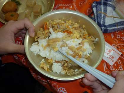 ひなまつりには,ちらしずしを食べる習慣があり,今日の給食もちらしずしでした。ちらしずしの具は「かんぴょう」に「しいたけ」,「にんじん」,「たけのこ」,「れんこん」,「しらす干し」,「いりたまご」で,ちらしずしの具をごはんに混ぜて,「きざみのり」をかけて食べました。ほんのりと酢の香りがして,とってもおいしくちらしずしをいただくことができました。