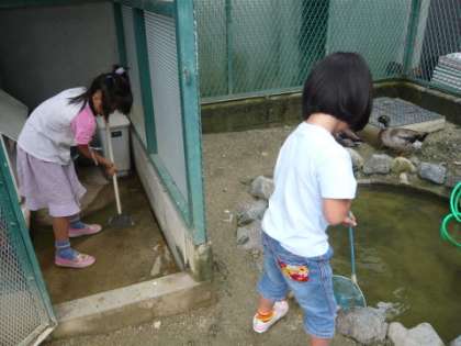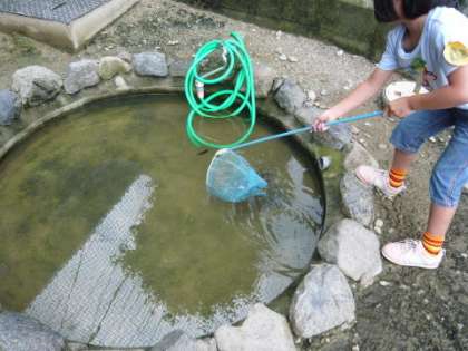 小屋の中に入ると,最初はお掃除です。もう1人は池のゴミを網ですくって,お掃除をします。