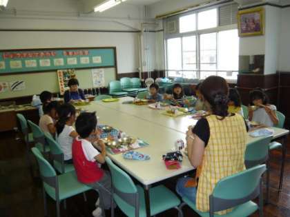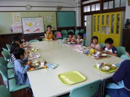 テーブルを囲んで子どもたちと担任の先生,栄養教諭の先生が座り,いつもとは違った雰囲気の中で,おいしそうに給食を食べていました。