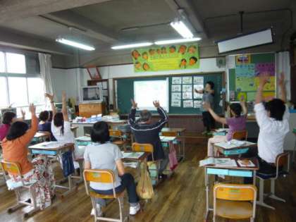 英語活動の目的や重要性を知り,主に担任による具体的な指導法を探ることを目的に,本校では教職員の英語活動研修を,年間8回程度実施する予定をしています。昨日6月11日(木)放課後に,本年度第1回目の英語活動研修会を実施しました。最初に「英語ノート」と「京都市テキスト」の違いについての説明と,インタラクティブ・ユニット(通称ブーメラン)の使用法の説明がありました。続いて英語ノートのレッスン3「友だちの誕生日を知ろう(when is your birthday?)」の,チャンツやゲームの実技研修を行いました。会場の6年生の教室は,日本語よりも英語の方が多く聞かれ,楽しく研修が進んでいました。