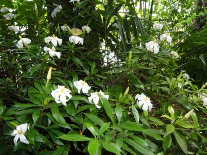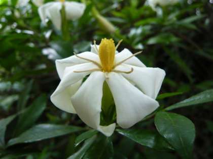 秋の「キンモクセイ」,春の「ジンチョウゲ」と同じく,香りのよい花木の代表「クチナシ」の花が,講堂の東側に咲いています。大和大路通からは樹木の陰になって見えにくいのですが,かすかに「クチナシ」の香りが漂っています。この「クチナシ」の名前の由来は,果実が熟しても割れないため,「口無し」から「クチナシ」となったそうです。