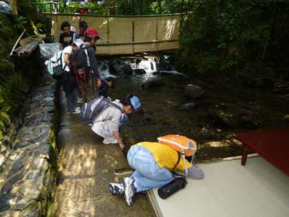 りっこう学習(総合的な学習の時間)で,校区の西を流れる「鴨川」について調べている5年生が,鴨川の上流の探検に出かけました。行った先は「奥貴船」,貴船の料理旅館で「川床」(画像左)を見せていただいたり,奥貴船の川の水の冷たさを体験(画像右)したりしました。この「鴨川上流探検隊」の詳しい様子は,後日5年生のページでお伝えします。