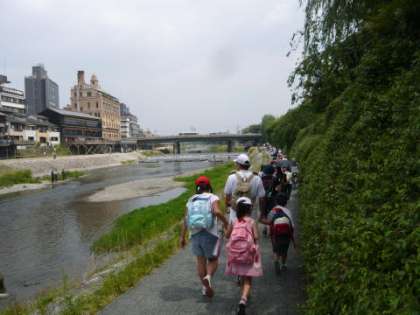 松原橋上流から鴨川東岸の河川敷に降り,団栗橋,四条大橋,三条大橋,御池大橋の順に歩を進めました。