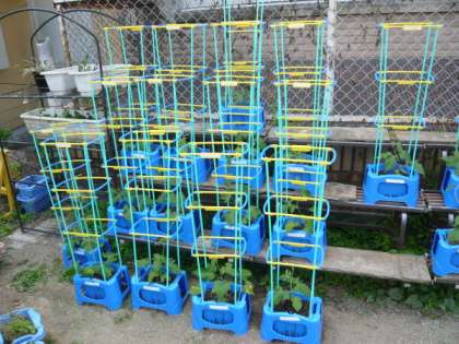 支柱を立てた後は,やっぱり水やりでした。1時間目が始まるまでに,支柱の立ったアサガオの青い鉢がズラリと並びました。