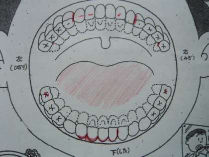 今週は,「歯のカラーテスト週間」でした。歯のカラーテストとは「歯垢の染め出し」のことで,歯を磨き残したところが赤く染まり,一目でどこがうまく磨けていないかが分かります。カラーテストの仕方は,(1) カラーテスターを口に入れて噛み砕き,舌で歯に塗りつけます。(2) ブクブクうがいをします。(3) 鏡をよく見ながら用紙に書かれた歯に,赤くなっているところ(磨き残しのところ)に色を塗ります。このように色を塗った用紙は,家庭に持ち帰って家族と歯磨きについて話し合ったり,用紙をよく見て磨き残しのないようにしたりします。カラーテストによって歯の汚れやすいところを知り,きちんとした歯磨きができるようになると思います。