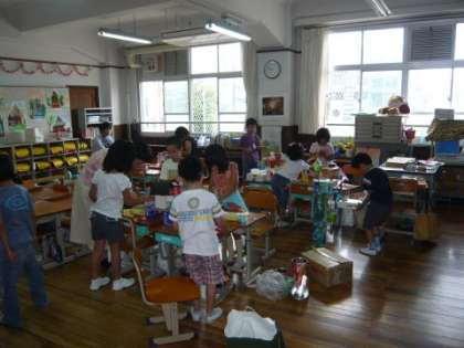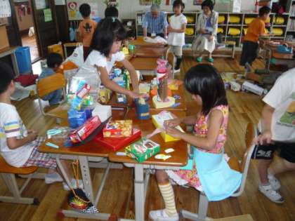 今日は,前期自由参観日の1日目です。1・2時間目に1年生が図工の時間に,いろいろな空き箱や容器を積んだり並べたりして,楽しい「家」や「船」,「ロボット」,「ロケット」などをつくっていました。空き箱や容器がバラバラにならないように,接着剤を上手に使って,色や形も考えながら工夫して工作を楽しんでいました。