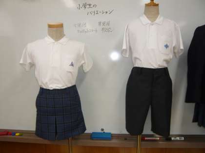 画像は上から「中学生の標準服」,中は「小学生の標準服」,下は「小学生のバリエーション服」です。中学生はカッターシャツにネクタイを締めますが,小学生はカッターシャツの変わりにポロシャツでネクタイはなし,小学生のバリエーション服は男子用は半ズボン,女子用はキュロットスカートになっています。