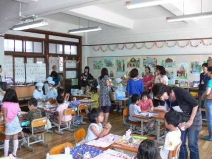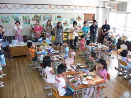 1年生の教室に会場を移して,給食の配膳の様子や給食を食べている様子をご覧いただきました。