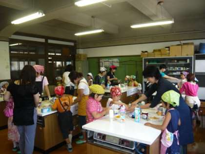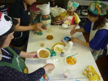 新道小学校PTA学級委員会主催の1年生のPTA学級活動が,自由参観日2日目の昨日6月24日(水)午後に,家庭科室で実施されました。このPTA学級活動は,親子の絆を深めたり,親同士,親と担任とのふれあいを深めたりします。1年生のPTA学級活動は,「バナナ」や「パイナップル」,「アイスクリーム」,「コーンフレーク」などを使って,それぞれが思い思いの「パフェ」をつくりました。1年生の子どもたちはグループに分かれて,お手伝いのお母さんたちと一緒に楽しそうにパフェをつくっていました。できあがったパフェは,「とってもおいしい」と大評判でした。