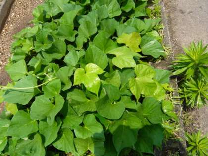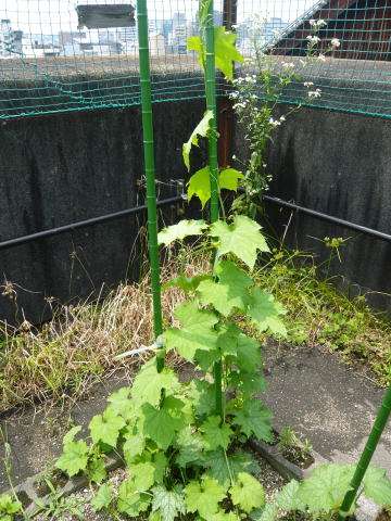 梅雨の最中とはいえ,今日は日照時間が長く気温も急上昇。京都地方気象台によると,午後3時に32度になったと聞きます。そのような中で本校の屋上の学級園では,ご覧のように4年生の育てている「ヘチマ」が背丈をグングンと伸ばし,3年生の育てている「ホウセンカ」はビックリするほど立派に成長してきました。また,2年生の育てている「サツマイモ」も葉を青々と茂らせています。このサツマイモの葉の間をよく見ると,「アサガオ」の大きな葉が見えるのが分かるでしょうか。もう初夏を過ぎ,夏真っ盛りですね。