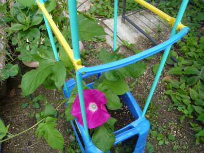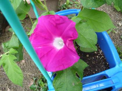 1年生が大事に育てている「アサガオ」に,ご覧のような花が二輪咲いているのを見つけました。ピンク色の一輪は1年生一人一人が育てている青い鉢で,もう一輪は植え替えをしたプランターで見つけました。これから気温もグングン上がって,水やりの世話をしっかりと続けると,「アサガオ」の花がいっぱい開くと思います。1年生のみなさん,がんばって「アサガオ」の世話を続けようね。