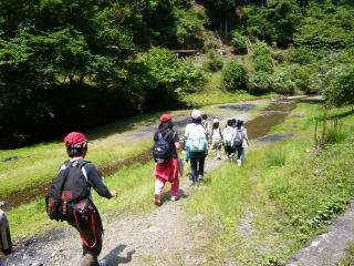 貴船のバス停から貴船神社の見学,川床の見学を経て約50分,目的地の奥貴船橋付近に到着しました。河原に降りて水着に着替えて,探検の準備を行いました。