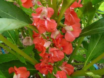 3年生が屋上の学級園で育てている「ホウセンカ」に,ご覧のような赤とピンクの花が咲きました。この「ホウセンカ」,背丈が大変高く,茎周りも太くて,とっても立派に育っています。まだ花が咲いているのは数株ですが,梅雨明けとともにたくさんの花を見ることができるものと思います。