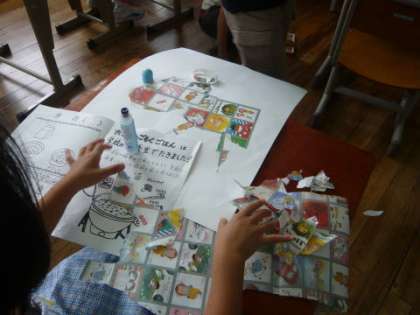 最初に,包装紙や新聞紙,ちらしなど,様々な紙をちぎったり,切ったりして,画用紙にのり付けしていきました。