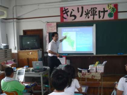 河川課の方のお話は,京都府の紹介と河川課の仕事のお話から始まりました。京都府には390もの河川があることや,その河川の総延長が2000kmほどあることを聞き,子どもたちはびっくりしていました。その後,京都府が発行している冊子「わたしたちの鴨川」をもとに,プレゼンテーションを交えて「鴨川の様子」や「鴨川の歴史」,「鴨川の課題」などについてのお話を聞きました。