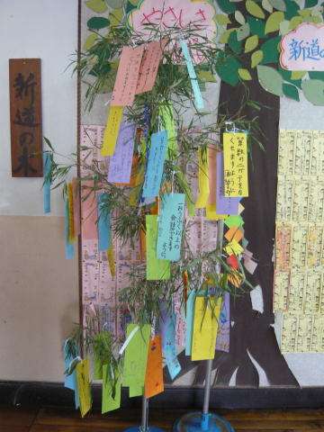 今日7月7日は「七夕」,新道の木の前に置かれた笹に,いろいろな願い事が書き込まれた笹飾りの短冊を取り付けました。